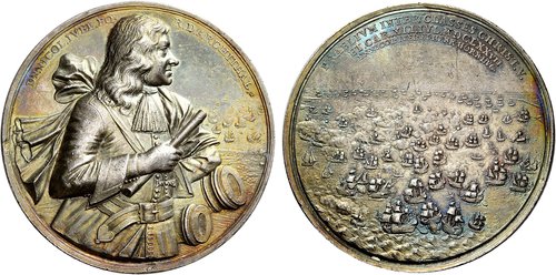 This large and heavy medal was designed by Christofer Schneider, a medalist working in Copenhagen during the last quarter of the 17th century. He also produced a very much larger version of this medal, weighing 49 ounces (!), which is one of the biggest medals ever struck. The battle itself was between the combined Danish and Dutch fleets, under the general command of the famous Dutch admiral Cornelis Tromp, and the Swedish fleet under Baron Lorentz Creutz. On paper the Swedes had a much more powerful fleet: their flagship, the Stora Cronan(The Grand Crown), was at the time the largest warship in the world (126 guns and a compliment of 850 men). However, the Swedes were caught in a lee and when their flagship sought to turn, her open gun ports allowed the sea to enter and she capsized and then exploded when candles fell into the powder stores. By the end of the battle the Swedes were routed. It should be noted that while the medal gives the date 1 July 1677 for the battle, it actually took place on 1 June 1676! As for the Scanian War (1675-1679), it pitted Sweden and to some extent France against the combined forces of the Netherlands, Denmark and Brandenburg. The Swedes lost at sea and on land against the Brandenburgers, but defeated the Danish army. In the end the marriage of the Swedish king Charles XI to a Danish princess, and other complex negotiations, ended up ensuring that virtually nothing was changed by the war.