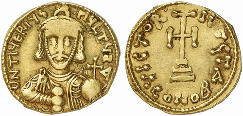 Tiberius Petasius. 728 or 730/731. Solidus (Gold, 4.03 g 6), Blera (in Latium, near Rome) or, perhaps more likely, Naples. TIUERIUS MULTUS A Facing bust of Tiberius, wearing chlamys and a diadem with cross over a circlet, holding globus cruciger in his left hand and akakia in his right. Rev. VICTOR.IVTGTA Cross potent on base and two steps. F. Füeg, “Byzanz: Zu Prägungen aus dem 8. bis 11. Jahrhundert, Teil 1,” SM 196, 1999, 73, A (this piece cited). Unique and of the greatest historical importance. Minor marks and some minor striking flatness, otherwise, about extremely fine.