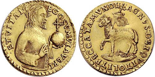 Holy Roman Empire, Klagenfurt. 2 Ducats (Gold, 25.7mm, 6.81 g 11), School prize from the Protestant Gymnasium in Klagenfurt, Carinthia, undated but c. 1555. EGO.SVM.VIA.VERI: .ET.VITA.I.4 (=I am the way, the truth and the life. (John 14)) Half-length, nimbate bust of Christ to right, raising His right hand in blessing and holding a globus cruciger in His left. Rev. :AGNVS:DEI.QVI TOLIT PECCATA.MVNDI: (=Lamb of God who takes away the sins of the world) Lamb standing left on field, bearing long cross with pennant. Cf. Lanz 87, 19 May 1998, 505 (same dies). Very rare, apparently one of only two or three known examples. Impressive and attractive. Good very fine.