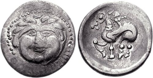 CELTIC, Middle Danube. Uncertain tribe. 2nd century BC. AR Drachm (2.71 g, 10h). Facing gorgoneion with protruding tongue / Horseman riding left. Lanz -; CCCBM I -; KMW 1125. VF, toned, minor porosity. Rare.