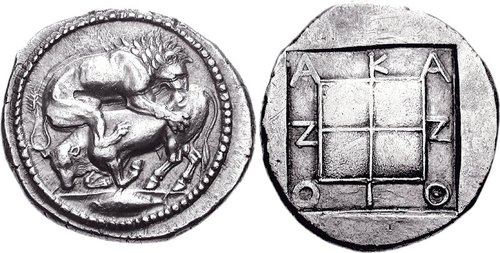 MACEDON, Akanthos. Circa 470-430 BC. AR Tetradrachm (17.06 g, 2h). Attic standard. Lion, right, attacking bull kneeling to left, biting into his hindquarter; in exergue, tunny left / Ethnic around quadripartite square, the quarters raised and granulated; all within incuse square. Desneux 95-102 var. (unlisted dies); AMNG III 21; SNG ANS -. Good VF, slight die shift.
