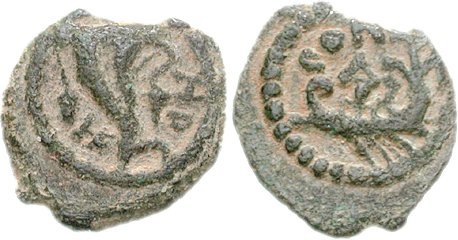 JUDAEA, Herodians. Herod II Archelaus. 4 BCE-6 CE. Æ Prutah (1.14 g, 12h). Jerusalem mint. Two cornucopias / Galley left. Cf. Meshorer 71a-f; Hendin 504. Good VF, sandy green patina.