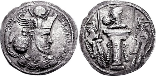 SASANIAN KINGS. Bahram IV. AD 388-399. AR Drachm (4.01 g, 3h). HLYDY (Herat) mint. Crowned bust right / Fire altar with attendants and ribbon; altar surmounted by bare head right. SNS Type Ia1/2a; Göbl I/1. VF, toned, small nick on edge.