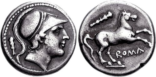 Anonymous. 230-226 BC. AR Didrachm (6.70 g, 8h). Rome mint. Helmeted head of Mars right; club behind / Horse galloping right; club above. Crawford 27/1; Sydenham 23; RSC 32. VF, deeply toned, tiny test cut on reverse edge at 5 o’clock. Rare.