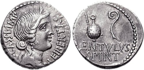 C. Cassius Longinus. 42 BC. AR Denarius (3.90 g, 6h). Military mint, probably at Smyrna. P. Lentulus Spinther, legate. Diademed head of Libertas right / Capis and lituus. Crawford 500/3; CRI 221; Sydenham 1307; RSC 4a. Good VF, toned.