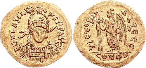 Basiliscus. AD 475-476. AV Solidus (4.46 g, 6h). Constantinople mint. Pearl-diademed, helmeted, and cuirassed bust facing slightly right, holding spear over shoulder and shield / Victory standing left, holding long cross; star to right; CONOB. RIC X 1003; Depeyrot 101/1. Near EF, underlying luster.