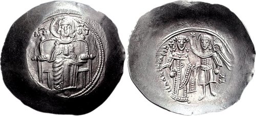 Isaac II Angelus. First reign, 1185-1195. EL Aspron Trachy (4.23 g, 6h). Constantinople mint. Seated facing figure of the Theotokos holding nimbate head of the infant Christ / Standing facing figures of the Archangel Michael, holding scepter and crowning Isaac, who is wearing crown and chlamys, holding cruciform scepter and akakia. DOC 2a; SB 2002. Good VF.