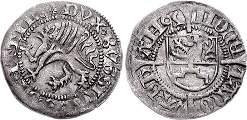 GERMANY, Pommern [Pomorze]. Bogislaus X. 1474-1523. AR Schilling (1.26 g, 8h). Damm mint. Dated 1492 (retrograde “2”). Griffin facing left / Coat of arms of Rügen on long cross. Schulten 2769 var. (normal “2”); Levinson I-288b; Frey -. VF, toned. Scarce.