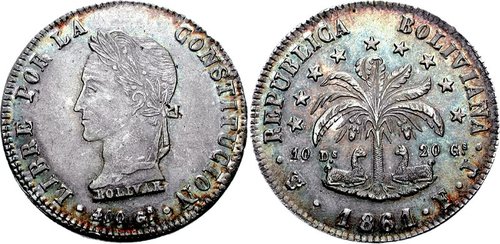 BOLIVIA, Republic. 1825-present. AR 8 Soles (20.15 g, 6h). Potosi mint; Fortunato Equivar and Joaquin Zemborain, assayers. Dated 1861. Laureate bust of Simon Bolivar left / Llamas reclining on either side of palm tree; denomination across field; Potosi monogram, 1861 and •F•J• in exergue. KM 138.6. Superb EF, traces of iridescence. Overstruck on KM 97.