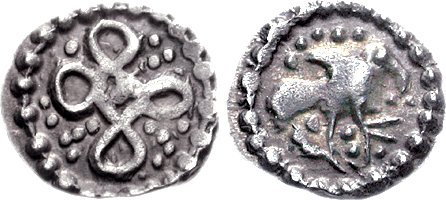 ANGLO-SAXON, Secondary Sceattas. Circa 725-745. AR Sceat (1.22 g). Series Q-related. Interlaced cross around central pellet; pellets around / Degenerate bird (hen?) standing right; pellets around. Beowulf 80 (this coin); Abramson -; Metcalf -; North -; SCBC -. EF, toned, slight weakness of strike. Extremely rare, possibly unique.