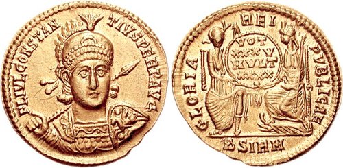 Constantius II. AD 337-361. AV Solidus (4.45 g, 1h). Sirmium mint, 2nd officina. Struck AD 355-361. Pearl-diademed, helmeted, and cuirassed bust facing slightly right, holding spear and shield / Roma and Constantinopolis enthroned facing, supporting between them a shield inscribed VOT/XXXV/MVLT/XXXX in four lines; Roma holds spear, Constantinopolis holds scepter and rests foot on prow; BSIRM. RIC VIII 61; Depeyrot 15/1. Choice EF, shallow scratch in left obverse field.