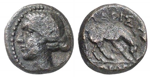 LARISSA. Æs, 400/344 v. Chr.; 2,46 g. Nymphenkopf l.//Pferd grast r. Rogers 301; SNG Cop. 145.
