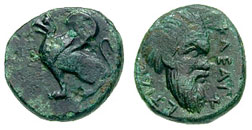 THRACE, Abdera . Circa 411-385 BC. Æ 13mm (1.59 gm). Griffin seated left / KLEAIN-ETIDS, mask of Pan right. May 309ff var. (unlisted dies); BMC Thrace -; SNG Copenhagen 369 var.; Laffaille -. VF, dark green patina. ($100)