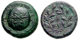 EPEIROS, Epeirote Republic . Before 340 BC. Æ 18mm (5.53 gm). MOLOSSWN, round shield with thunderbolt in center / Thunderbolt within laurel wreath. Franke 24ff (dies not listed); SNG Copenhagen 54; BMC Thessaly pg. 101, 3; Laffaille 337; Pozzi 2974. Good VF, glossy dark green and black patina, reverse a little rough. ($300)