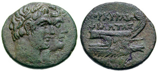 KORKYRA . Circa 229-48 BC. Æ 27mm (10.44 gm). Jugate heads of youthful Herakles, laureate, and Korkyra, wearing an ivy wreath, right / KORKURAIW-N, prow of a galley right; FILWTAS Prytanes. SNG Copenhagen 240; BMC Thessaly pg. 152, 557; Laffaille -. VF, heavy, dark green patina. ($250)
