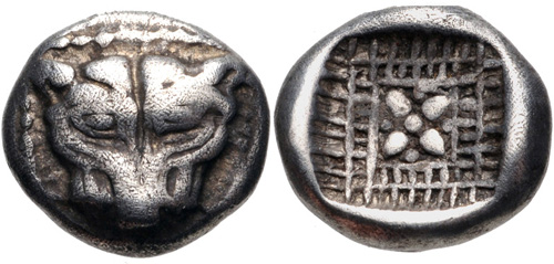 IONIA, Miletos. Late 6th-early 5th century BC. AR 1/8 Stater (10mm, 1.61 g). Lion’s head facing / Floral or stellar design within square lattice frame; all within square incuse. SNG Kayhan 455-9; SNG Keckman 262. VF, toned.