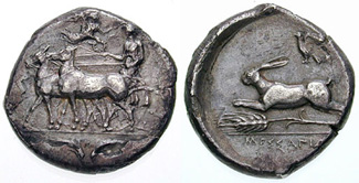 SICILY, Messana. Circa 412-408 BC. AR Tetradrachm (16.15 gm). Charioteer driving walking biga of mules left, holding kentron in right hand, reins with both; two dolphins in exergue, Nike flying above crowning charioteer / MESSANIWN in exergue, hare springing left; grain ear below, bird above. Caltabiano 623 (D223/R249); Rizzo pl. xxvii, 7 (same dies); SNG Lockett 831 (same obverse die); SNG Copenhagen 405 (same dies). Toned VF, obverse corrosion. ($750)