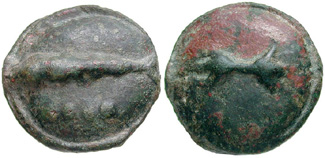 APULIA, Luceria. Circa 269-225 BC. Æ Aes Grave Quatrunx (123.69 gm). Thunderbolt / Club; •••• right. Thurlow-Vecchi 275; Haeberlin pl. 70, 10-11. VF, green and red patina. Rare, only nineteen specimens recorded in Thurlow-Vecchi. ($600)