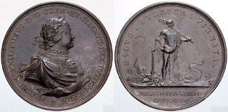 RUSSIA. Peter I. 1698. AR 66mm Medal (102.47 gm). By S. Judin. The destruction of the mutinous Streltzy. PETRVS. ALEXII. FILIVS. D. G. TZAR. ET. MAGNVS. DVX. TOTIVS. RVSSIÆ, laureate bust right, Cyrillic legend in arm truncation / SALVS. PVBLICA. FIRMATA., PERDUELLIBUS. DELETIS/mDCXCVIII in two lines in exergue, Hercules standing partly right, holding club and burning with torch the decapitated head of the slain Hydra. Tire 7; Iverson IX/1. Toned, good VF, a few marks in fields. ($2000)
