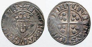 Edward I. 1272-1307. AR Penny (1.39 gm). Long cross coinage, class 1a. Struck May to December 1279. London mint. EDW REX ANGL DNS hYB, crowned facing bust / CIVI-TAS LON-DON, long cross with trefoil in each angle. North 1010; Wren pg. 62; Seaby 1380. Toned, good VF. Extremely rare. ($1000)