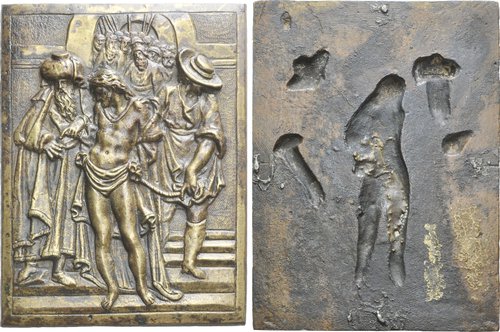Italy, Lombardy. Mid to later 16th century. Plaquette (Bronze, 119 x 86mm, 243 g), by an anonymous northern Italian artist. Christ, his arms bound behind him, a cloak over his shoulders and a cloth over his loins, standing facing at the bottom of a flight of steps, his head turned slightly to left; on the left, a bearded priest, wearing long robes and a turban, stands facing on the step behind, pointing at something held in his hand; on the right, on the step above, a soldier, wearing shorter robes, boots and a wide-brimmed hat, stands facing, holding the fetters that bind Christ, but looking away from him to the right, his face covered by his hat; behind, in the arched doorway at the top of the steps, a crowd of men, some holding pikes.