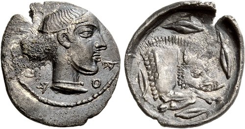 This coin is both exciting and infuriating: exciting, because it is clearly from a new Sicilian mint, and infuriating, because its inscription, which appears to read, retrograde and in archaic lettering, Boro makes no obvious sense! It would be reasonable to assume that this coin was an ancient imitation of some sort, based on coins produced by a major city (like the many crude imitations of Syracusan fractions, produced by the Sikels and others). However, the quality of the engraving of this coin precludes that possibility. The head of the goddess on the obverse is immediately reminiscent of that on some issues of Segesta, with issues of Syracuse, and with some heads of Apollo at Leontinoi; it can probably be dated around 450 (note the way the bun at the back of her head sticks straight out rather than down). As for the forepart of the boar on the reverse, it is is not only perfectly made but is otherwise unknown in Sicily and must have been specifically requested rather than simply copied; though the four wheat grains around it come directly from the tetradrachms of Leontinoi. Thus, the possibility that this coin was struck by a small town in the area of Leontinoi, and under that city’s influence, seems reasonable. Unfortunately, no such town or tribal grouping - with these four letters in its name - appears to be known. As has been said before, this is a coin that deserves further research.