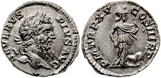 SEPTIMIUS SEVERUS. 193-211 AD. AR Denarius (4.23 gm). Struck 207 AD. SEVERVS PIVS AVG, laureate head right / P M TR P XV COS III P P, Africa standing right, wearing elephant's skin headdress, holding out fold of drapery; lion right at her feet. RIC IV 207; BMCRE 531; RSC 493. EF. ($200)