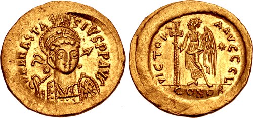 Anastasius I. 491-518. AV Solidus (2021mm, 4.47 g, 6h). Constantinople mint. Struck 492-507. D N ANASTA–SIVS P P AVG, helmeted and cuirassed bust facing slightly right, holding spear over shoulder in right hand, shield over left shoulder / VICTORI–A AVGGG, Victory standing left, holding long, jeweled cross in right hand; star in right field; L//CONOB. Unpublished in the standard references with this unusual “officina” marking. Choice EF.