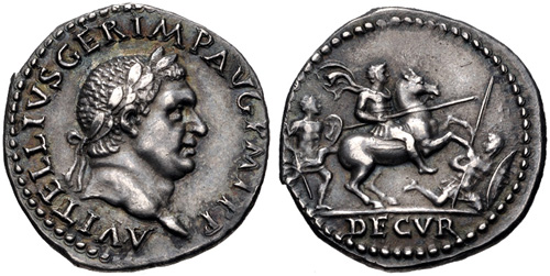 ROMAN IMPERIAL. Vitellius. AD 69. AR “Denarius” (3.65 g). Reverse die by Luigi Cigoi, 1811-1875. Rome mint. Laureate head right / Decursio scene: Nero on horseback riding right, holding spear; behind him, soldier right, holding spear and shield; before, soldier falling forward, holding spear and shield; DECVR in exergue. Brunetti,