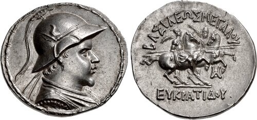 By 240 BC, the regions encompassing modern Afghanistan, western Pakistan and northern India had broken from Seleukid rule to become independent under their own line of kings, which were showcased in a series of coin portraits of astonishing power and realism. Greatest of these was Eukratides I, who reigned circa 170-145 BC. His vast realm was larger than any other Greek-ruled kingdom of the time. Indeed he bestowed upon himself the title of Megas (”the Great”), as seen on his coinage. Eukratides struck silver coins in vast numbers and many survive today. This magnificent silver tetradrachm depicts Eucratides as a general wearing a broad-brimmed Baktrian helmet, greatly resembling a modern-day British explorer in a pith helmet. The portrait, rendered in sculptural high relief, is nearly photographic in its realism and exemplifies the virtuosity achieved by the artisans of this far-flung Greek enclave.