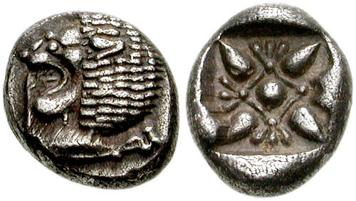 Late 6th-early 5th century BC. AR Obol (9mm, 1.19 g). Forepart of lion right, head left / Stellate pattern in square incuse punch. SNG Copenhagen 944-951; SNG Kayhan 476-482. Good VF.