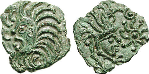 From the Prof. T.R. Gurr Collection.“Gryllus” is the Latin term for “cricket, or grasshopper.” Modern writers have adopted this word to describe fantastic creatures composed of metamorphosed animals and humans. The Celts had an innate fascination for these transformations, which endured throughout the Celtic period, even into medieval times in illuminated manuscripts. The bird creature on this bronze coin is not of a type frequently encountered in Celtic art, but may be an adaptation of a Roman type occasionally seen on carved gemstones. It is possible that a Celtic engraver saw this design and decided it would fit in nicely with his repertoire.