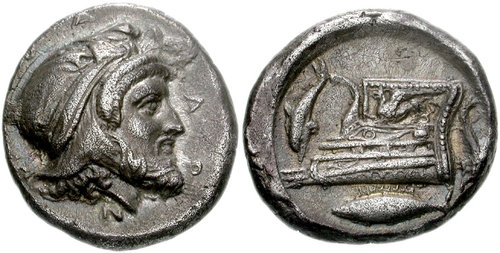 FAR-N-[A]-BA, head of Pharnabazos right, weaing satrapal cap tied below his chin, and diadem / Ornate ship’s prow left, decorated with a griffin and prophylactic eye; before and aft, two dolphins downward; below, tunny left. Maffre 5 (D5/R4) = Bozdek 7 (this coin); Winzer 9.3; SNG France 395; SNG von Aulock 1216; BMC 12; Franke & Hirmer 718. Good VF, toned, slightly granular surface. Very rare, Maffre located thirteen extant examples, eight of which are in museum collections.