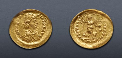 Electronic Auction 534 Lot: 736. Odovacar. King, AD 476-493. AV Tremissis (12.5mm, 1.42 g, 4h). In the name of Zeno. Mediolanum (Milan) mint. In ANACS encapsulation 7288704, graded VF 30 (as Julius Nepos in the name of Zeno).