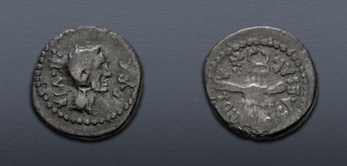 Electronic Auction 534 Lot: 495. The Triumvirs. Mark Antony. Early 42 BC. AR Quinarius (14mm, 6h). Lugdunum (Lyon) mint. In ANACS encapsulation 6160838, graded VG 8.