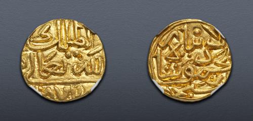 CNG Feature Auction 124 Lot: 802. Great Mongols. temp. Töregene Khatun. Regent, AH 639-644 / AD 1241-1246. AV Dinar (19.5mm, 4.11 g, 11h). Anonymous Kalima issue. Samarqand mint. Dated AH [6]40 (AD). Near VF.
