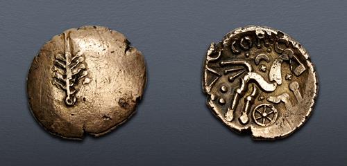 CNG Feature Auction 124 Lot: 992. CELTIC, Trinovantes & Catuvellauni. Cunobelin. Circa AD 10-43. AV Stater (15mm, 5.36 g, 8h). Cunobelinus Classic, stalk type (Trinovantian X). Camulodunum mint. Good VF.