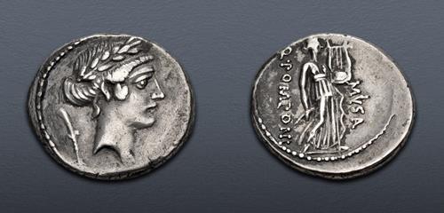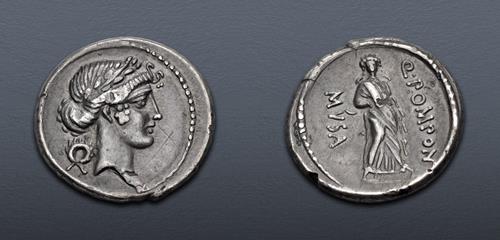 Electronic Auction 547 Lot: 747. Q. Pomponius Musa. 56 BC. AR Denarius (18mm, 3.63 g, 2h). Rome mint. Good VF.