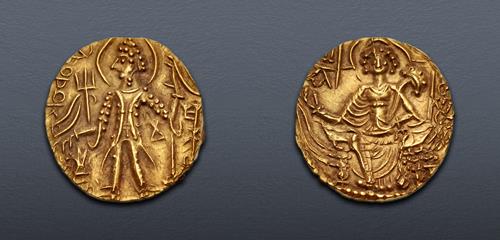 Electronic Auction 547 Lot: 508. INDIA, Kushan Empire. Vasudeva II. Circa AD 267-300. AV Dinar (20mm, 7.85 g, 12h). Main mint in Mathura/Gandhara. Good VF.