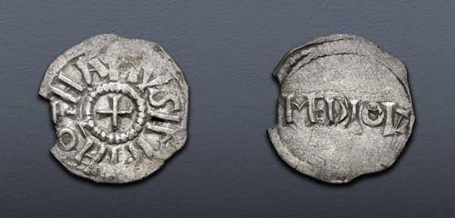 Electronic Auction 551 Lot: 645. CAROLINGIANS. Lothaire I. As Emperor, 840-855. AR Denier (22mm, 1.17 g, 9h). Mediolanum (Milan) mint. VF.