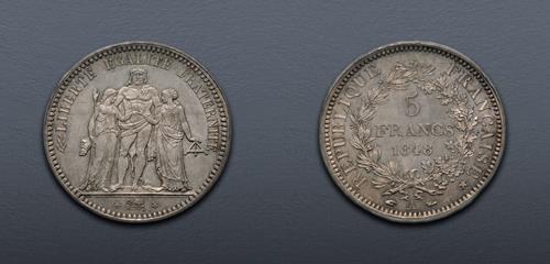 Electronic Auction 551 Lot: 727. FRANCE, Second Republic. 1848-1852. AR 5 Francs (37mm, 6h). Paris mint; différents: hand and dog’s head. Dated 1848 A. PCGS MS 64.