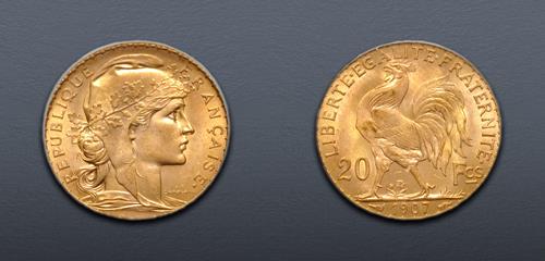 Electronic Auction 551 Lot: 728. FRANCE, Third Republic. 1870-1940. AV 20 Francs (20mm, 6h). Paris mint; différents: cornucopia & torch. Dated 1907. PCGS MS 65.