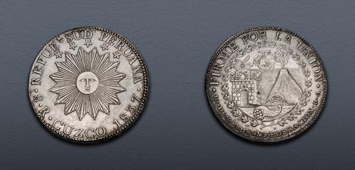 Electronic Auction 551 Lot: 763. PERU, Peru-Bolivian Confederation. State of South Peru. 1836-1839. AR 8 Reales (39mm, 12h). Cuzco mint. Dated 1837 BA. NGC AU 55.