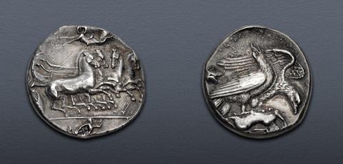 Electronic Auction 552 Lot: 875. REPRODUCTIONS, SICILY. Akragas. Circa 410-406 BC. Cast “AR Tetradrachm” (25mm, 13.53 g, 9h). Derived from an unsigned British Museum electrotype. As made.