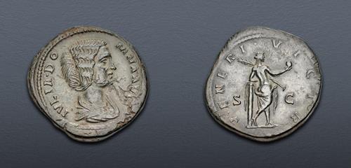 Electronic Auction 556 Lot: 590. Julia Domna. Augusta, AD 193-217. AR Antoninianus (22.5mm, 5.20 g, 6h). Rome mint. Struck under Caracalla, AD 215-217. Good VF.