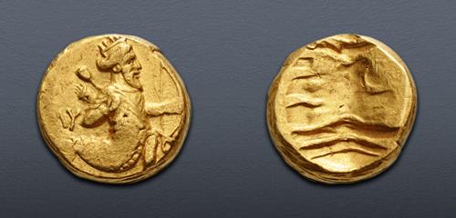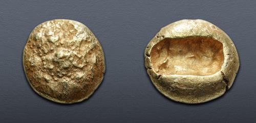 Triton XXVIII Lot: 309. KINGS of LYDIA. Alyattes. Circa 620/10-564/53 BC. EL Hekte – Sixth Stater (10mm, 2.35 g). Lydo-Milesian standard. Sardes mint. Near EF.