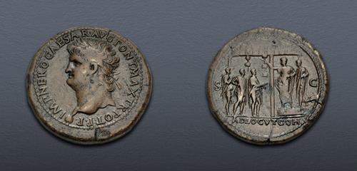 Triton XXVIII Lot: 663. Nero. AD 54-68. Æ Sestertius (36.5mm, 25.61 g, 6h). Lugdunum (Lyon) mint. Struck AD 66. Good VF.