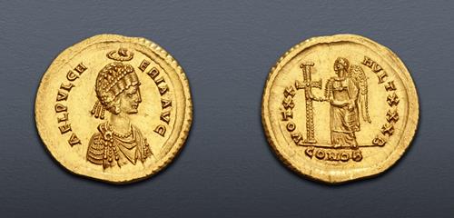 Triton XXVIII Lot: 795. Aelia Pulcheria. Augusta, AD 414-453. AV Solidus (21.5mm, 4.49 g, 12h). Constantinople mint, 2nd officina. Struck under Theodosius II, AD 422-423. Superb EF.