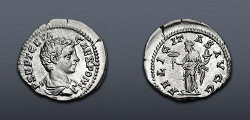 Electronic Auction 584 Lot: 773. Geta. AD 209-211. AR Denarius (18mm, 3.57 g, 6h). Rome mint. Struck under Septimius Severus and Caracalla, AD 200-205. Near EF.