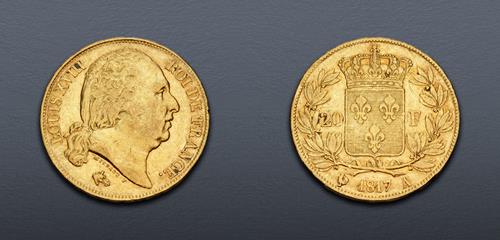 Electronic Auction 584 Lot: 976. FRANCE, Royal (Restored). Louis XVIII. 1814-1824. AV 20 Francs (21mm, 6.38 g, 6h). Paris mint; différents: horse’s head/rooster. Dated 1817 A. VF.